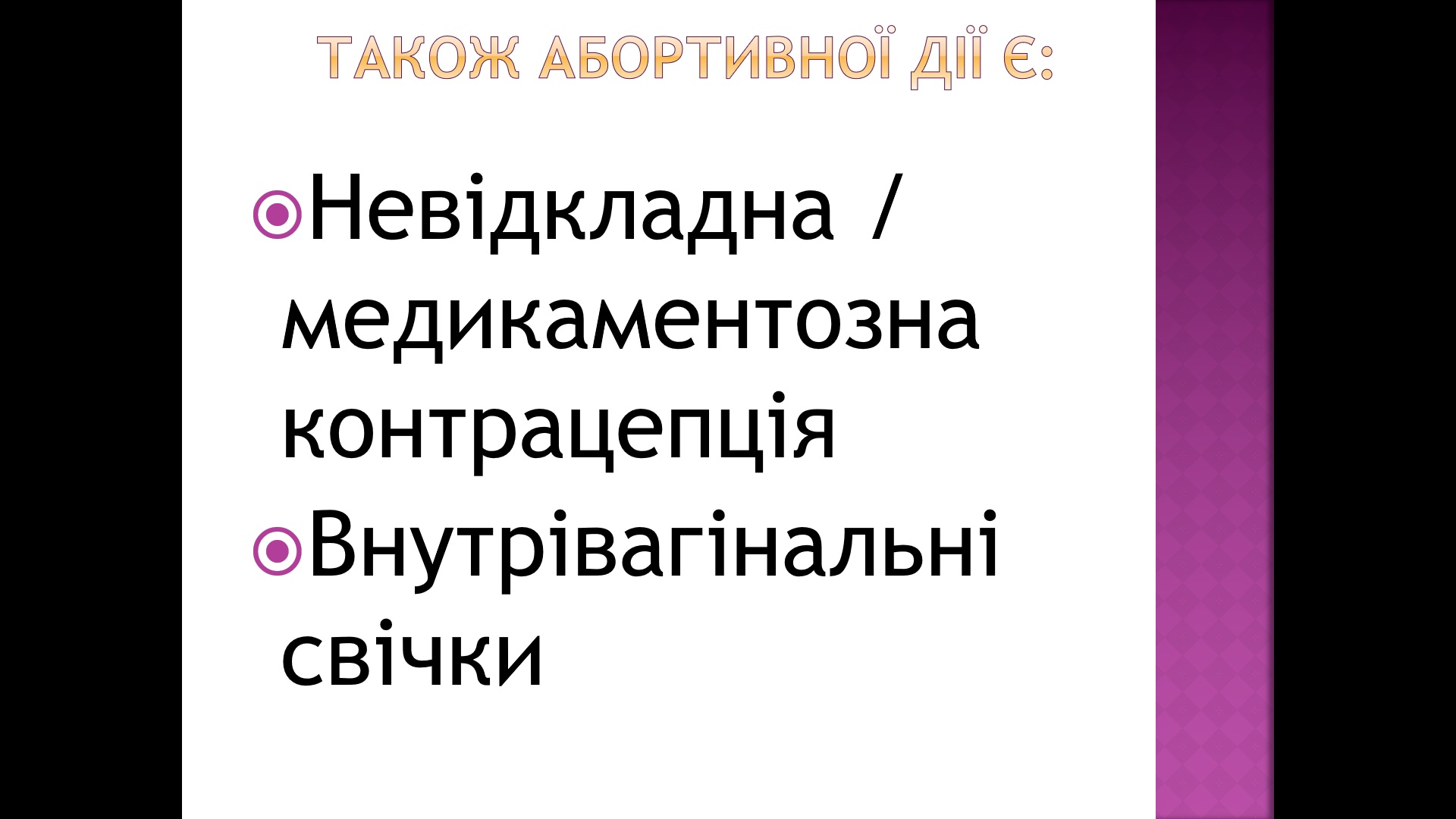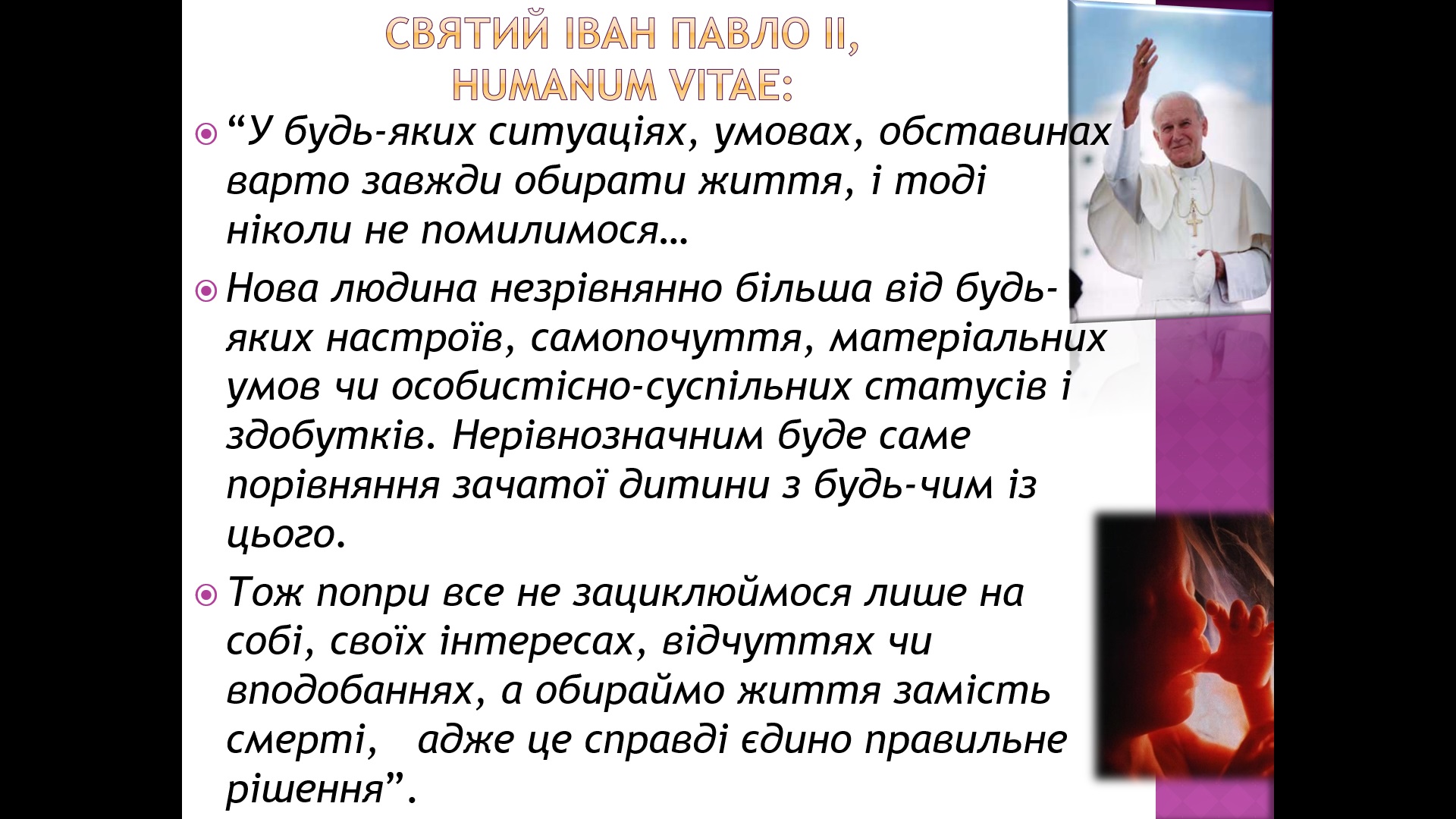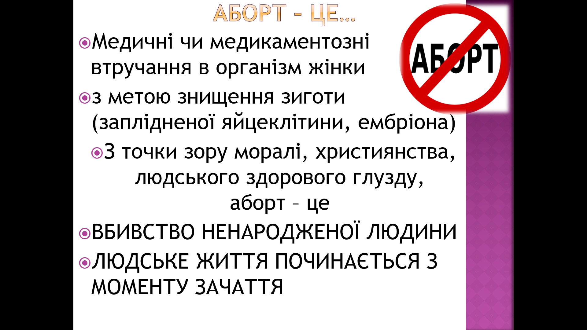 – Абортивна контрацепція, абортивні контрацептивні дії та технології, аборт – однозначне зло: вбивство ненародженої людини в лоні матері чи поза лоном, виконане підступною зброєю – найсучаснішими медикаментозно-технічними засобами (контрацептивами, контрацептивними діями та технологіями).