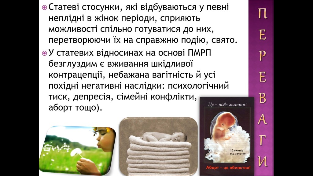 ПЕ.ЕС. ЯК БАЧИМО, ПМРП – своєрідний Божий дар людству. АДЖЕ в нашій природі і життєдіяльності міститься цікаве «програмне забезпечення» плідних і неплідних періодів. НАВІТЬ із раціональної точки зору негативом було би не користатись природною данністю і цікавою творчою функціональністю нашого організму, зокрема жіночого. НЕХТУВАННЯ такими природними механізмами нас самих – це «втеча» до використання контрацепції, онанізму, вбивання себе самих, вкорочення віку собі, своїй плідності й потенційному потомству.